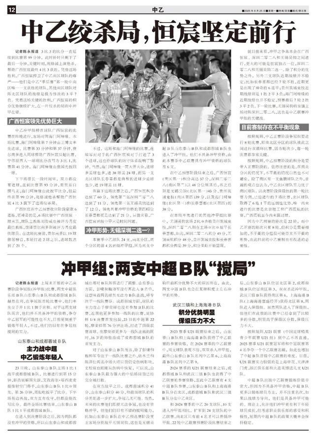 记者陈永报道3比3的比分一直延续到比赛第99分钟,此时补时只剩下了最后一分钟,关键时刻,苑修诚上演绝杀,帮助广西恒宸最终4比3获胜。凭借这场胜利,广西恒宸捍卫了中乙南区球队的尊严——他们是中乙“季后赛”第一轮中南区唯一一支获胜的球队,其他南区球队对阵北区球队的战绩是极为惨淡的3平7负。凭着这场关键的胜利,广西恒宸的积分优势继续扩大,在一片绞杀的局面中冲甲在望。
